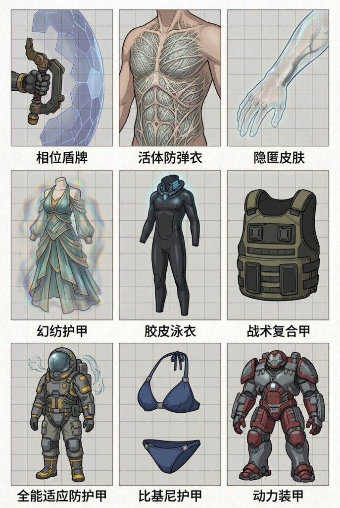 | 比基尼护甲 | 2,000 | 重甲 | 18 | 30 | 力量需求 15,隐匿劣势。看上去是不科学的泳装,实则是将穿戴者完整包裹的轻钢板甲。作为一个附赠动作,你可以启动其幻象回路,令这套护甲的外观看起来像是一套普通的衣物或泳装。 |