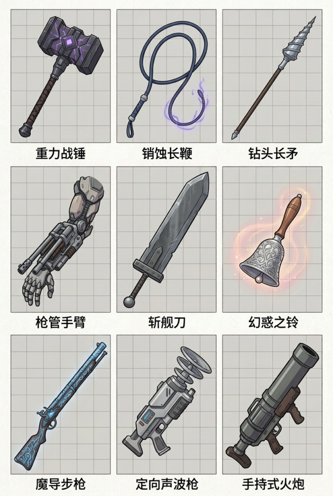 | 重力战锤 | 1d8 钝击 | 重力,多用(1d10) | 推离 | 5 | 500 |