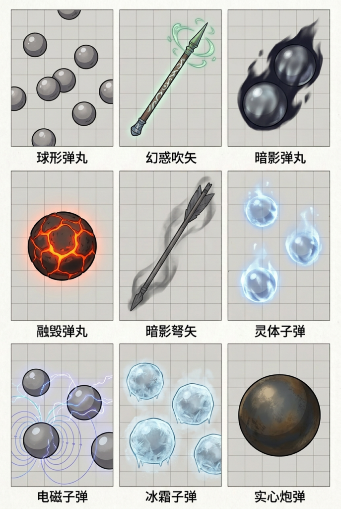 - 魔导枪械:通过魔导回路加速弹丸。该武器具有装填属性,括号内为弹匣容量(通常为 5 发)。每次攻击消耗一枚弹丸,当弹丸耗尽时,你必须花费一个动作更换弹匣。刻印了魔法的弹丸在射击后,无论是否命中都会失去魔法变为普通弹丸。