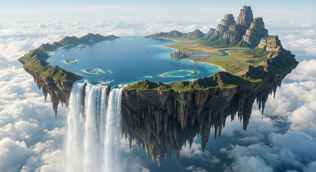 泰坦尼亚有着完整的水汽循环圈,它的顶部有约60%的面积是一片海洋,这片海洋的名字叫做蓝海。在空岛边缘,一圈低矮小山把这片海洋围起,只留下一个口子让海水奔腾而出,即尼亚卡特拉大瀑布。在与海洋相对的另一侧是层峦叠嶂的崇山峻岭。空岛下半部分是无数低垂的巨大石锥,整体组成不规则的圆锥形状。一道大河从山中流淌而出,在海边形成宽广的平原。海中也有许许多多珊瑚礁。
