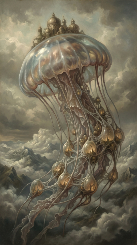 阿莱卡的外观看起来就像一只大得过分的水母,悠然自得漂浮在天地之间。古老的宫殿建立在它头顶,组成城市的囊泡在它触须之间用粘液网络沟通。居住在阿莱卡的永久居民全都是与它签订契约的魔契师,外来者在此过夜,将会遭受严重的心灵冲击。不过,魔契师们倒是可以离开这座岛屿,他们的宗主即使远隔万里也能把魔力输送过去。