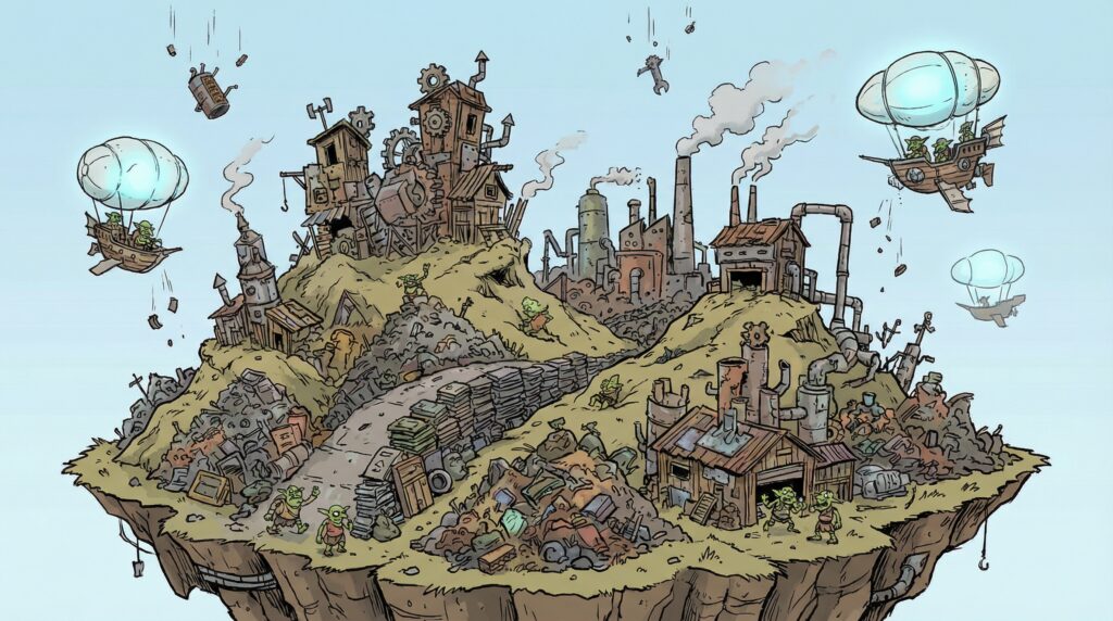 当外来者第一次看到伊莲特里亚时,一定会以为自己来到了一座超巨大垃圾填埋场。不过,如果仔细观察,会发现这座空岛其实还打理得有些眉目:有价值的垃圾按顺序摆到一块,垃圾山中间居然还清理出了道路,在成片成片的垃圾堆底下,依稀能分辨出像是建筑物的结构。由于修建材料也是各种废弃品,城镇在垃圾山之中有着天然的保护色。