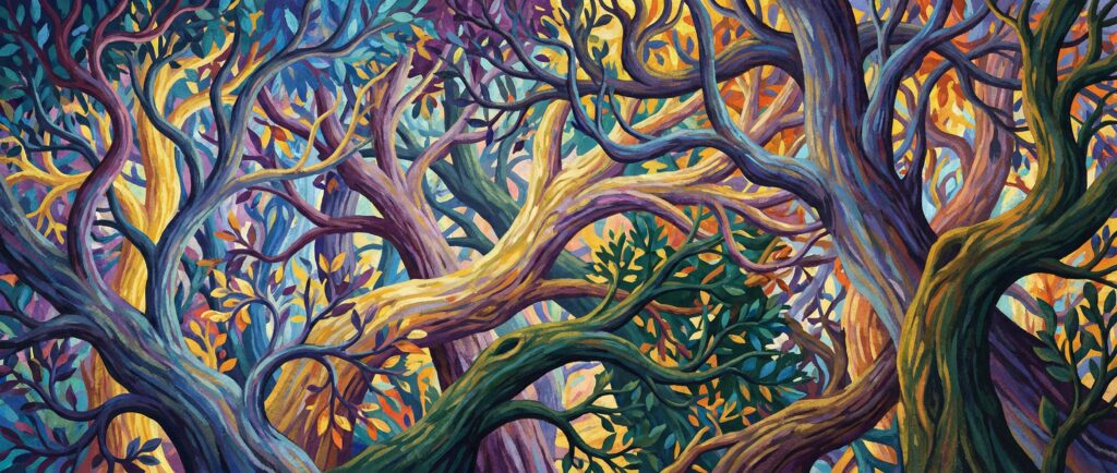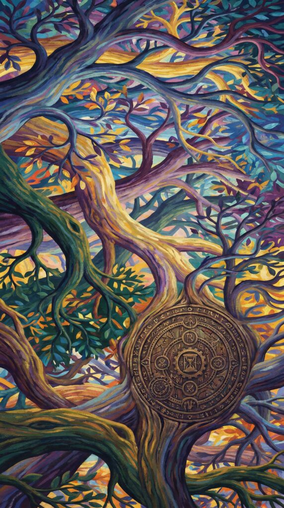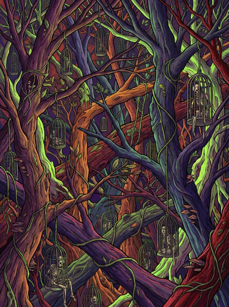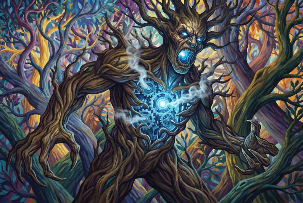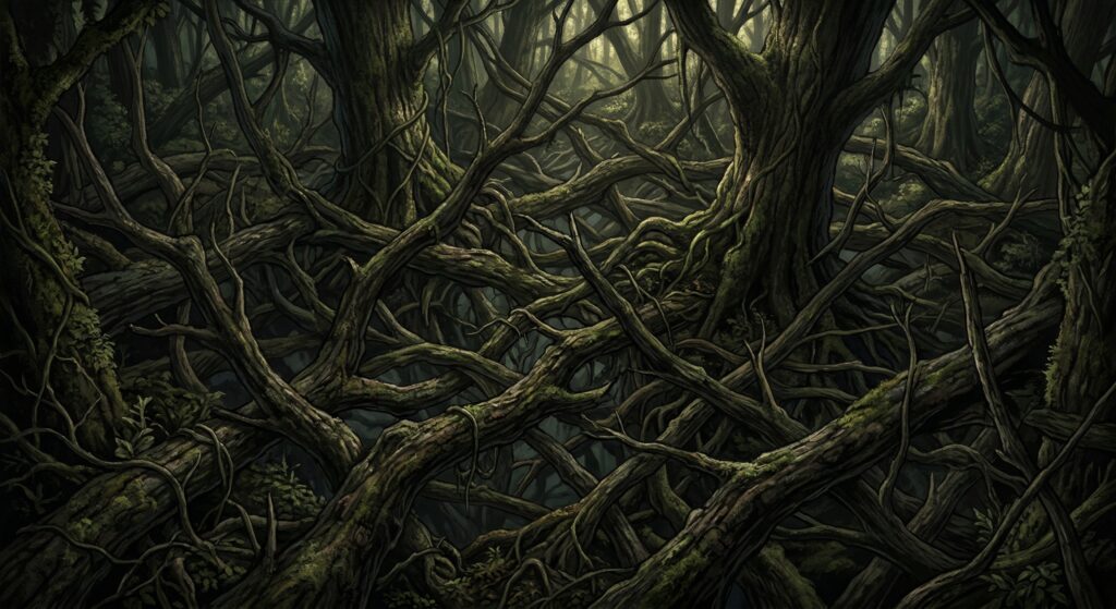 “晨雾如纱,在扭曲的树干间缓缓流动。阳光透过紫色的叶冠洒下斑驳光影,空气中弥漫着清新的树木鲜香,以及淡淡的血腥与烧焦气味。树木在你们身下延伸,无论往哪个方向都看不见陆地,只能走在粗大的树干上。”