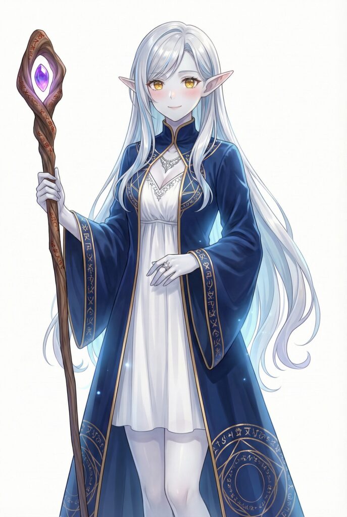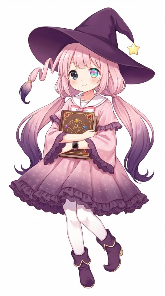 “她约莫十二岁,粉紫色双马尾神奇地一点泥土也不沾,轻飘飘的长裙泛着微微的魔法符文,符文仿佛在流动。她怀里紧紧抱着一本古朴的魔法书,手腕上还有一只时髦的智能手表。她突然睁开眼睛,黑黢黢的眼瞳里闪烁着奇异色彩。但没有说话。”
