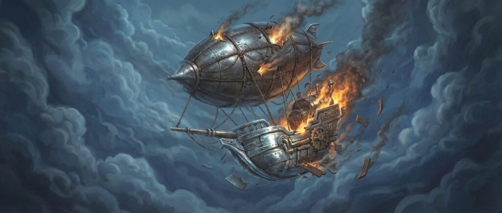 “你们乘坐的飞艇‘云鲸号’正穿越风暴云层。突然,空贼发射的炮弹击中主气囊!热浪翻滚,乘客惊叫四散。驾驶舱传来最后一声呼喊:‘引擎失控!所有人抓紧!’下一秒,整艘巨舰开始急速下坠⋯⋯”