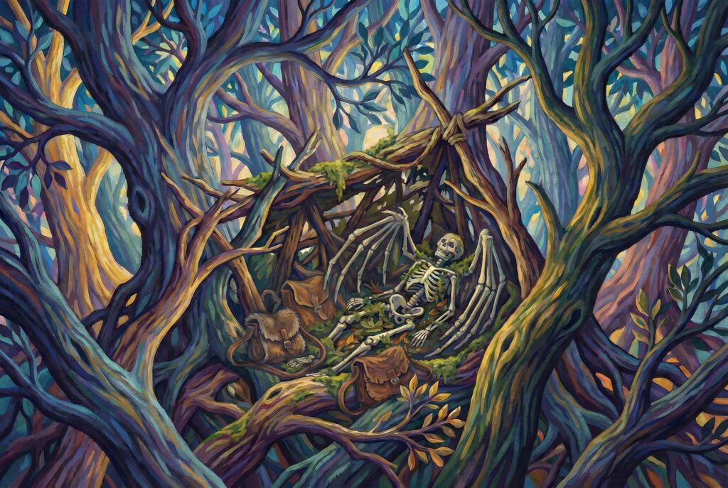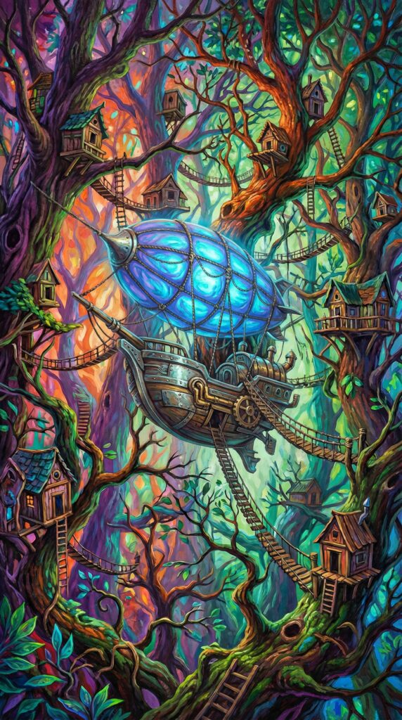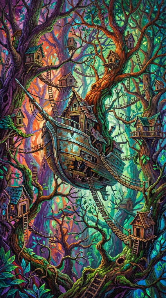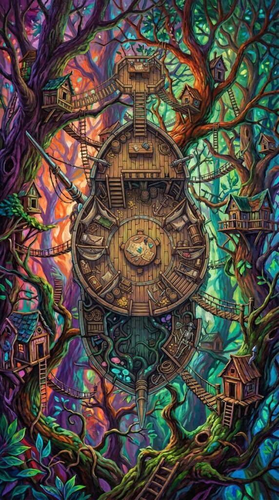 “拨开层层密林,一艘残破不堪的飞艇船头赫然出现在你们面前,树枝树桠之间攀附着绳梯与吊桥,挂在树上的木屋本该有生活气息,这会儿却是阴气逼人。”
