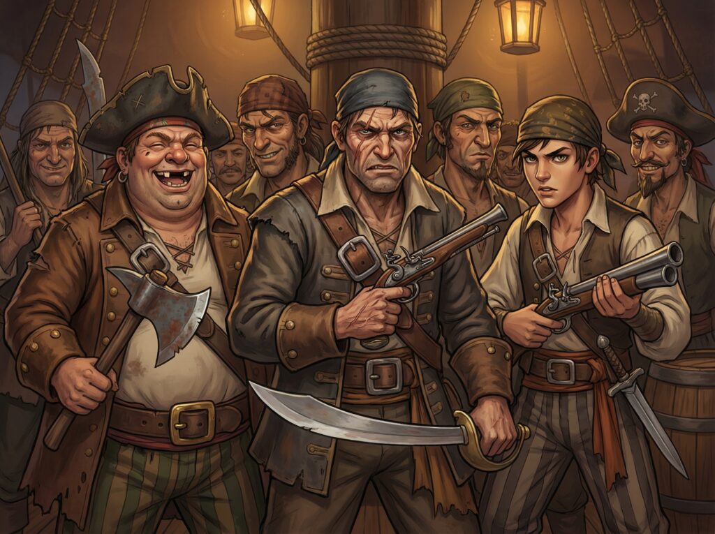 此章强调压迫感与抉择。建议使用昏暗灯光与滴水音效营造氛围。空贼喽啰在沉船堡内外来回巡逻。