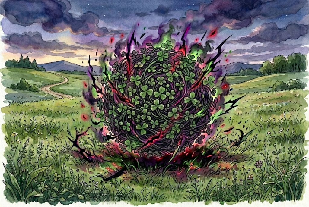 三叶草之怨是由无数被遗忘的三叶草植株聚合而成的恶意集群。它们通常生长在人们频繁搜寻四叶草的路径旁,因长期被忽视且目睹同类中的“幸运儿”被采摘珍藏,从而滋生了扭曲的怨念。这些植物不再进行光合作用,而是通过汲取路过生物的运气与生命力来维持存在。当冒险者踏入这片看似无害的草地时,往往会发现自己成为了这片绿色漩涡的猎物。