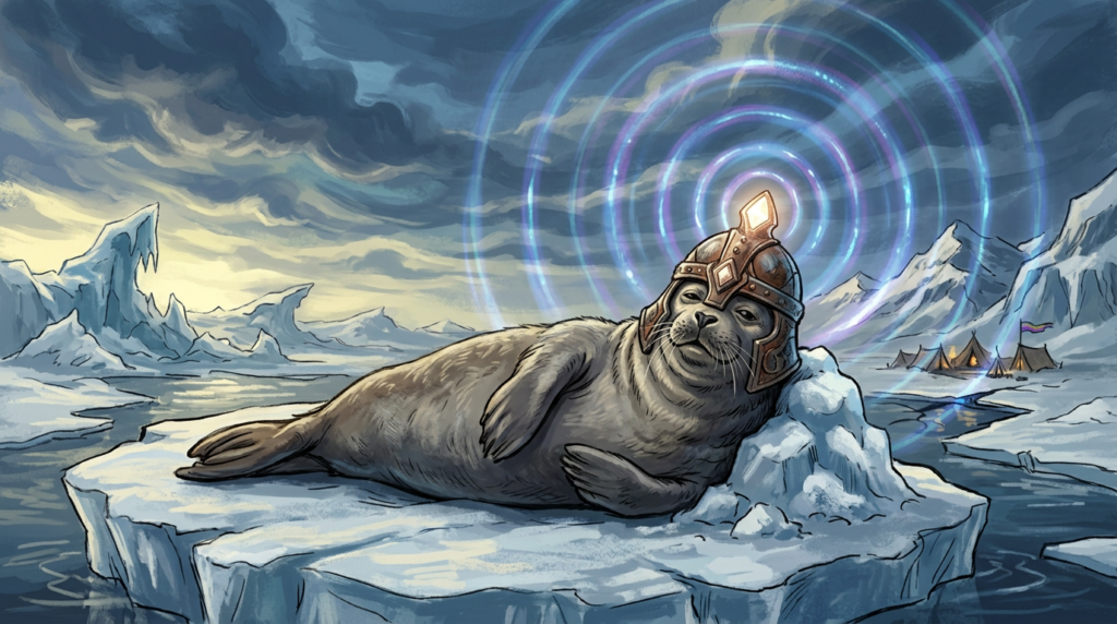 这种奇特的生物外表与普通海豹无异,唯独头顶佩戴着一顶无法取下的古老金属头盔。它们栖息在冰块上,是当地居民生存资源的主要竞争者。