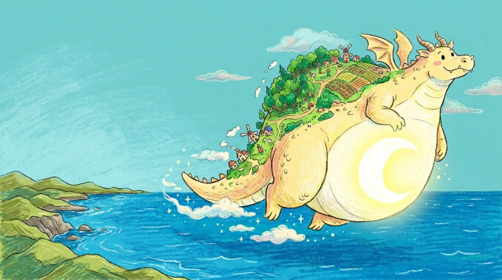 生态习性 露娜的生命节律与“食欲”紧密相连。不同于掠食性巨龙,露娜以抽象的“美感”为食。文学、诗歌、浪漫的誓言以及动人的旋律是她唯一的养分。当这些精神能量充盈时,她的腹部会散发出如满月般柔和而明亮的白光;而当诗歌匮乏、浪漫消逝时,她的光芒会逐渐黯淡,缩减为一弯细细的新月。这种独特的代谢方式使得她与背上的居民形成了一种奇妙的共生关系:人类为她创作史诗,她为人类提供栖息之所。